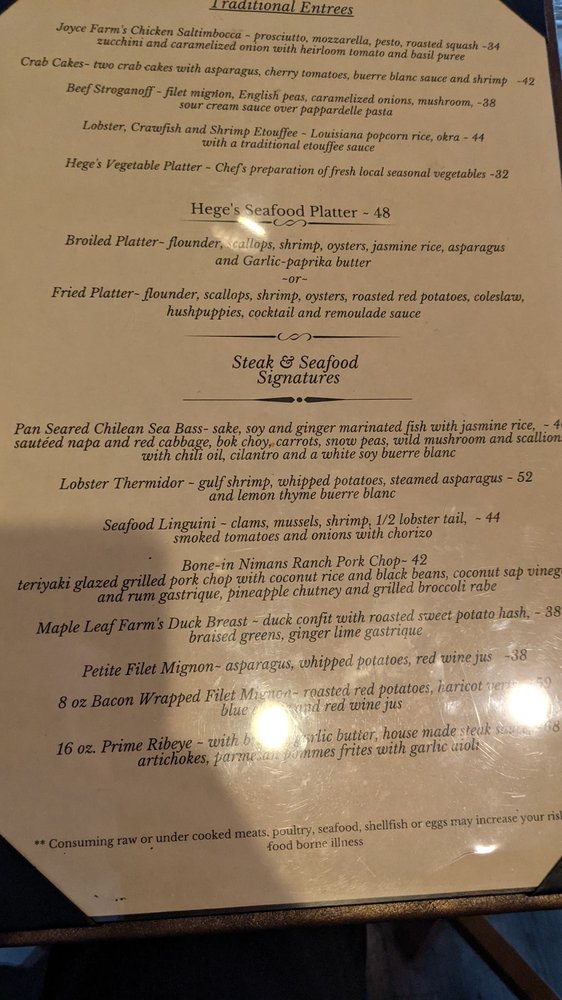 Hege's menu excels with signature dishes like the Pan Seared Chilean Sea Bass and Newberg Vol au Vent, featuring fresh, quality ingredients. Every plate promises a visual and taste sensation, as echoed in glowing reviews from satisfied diners.